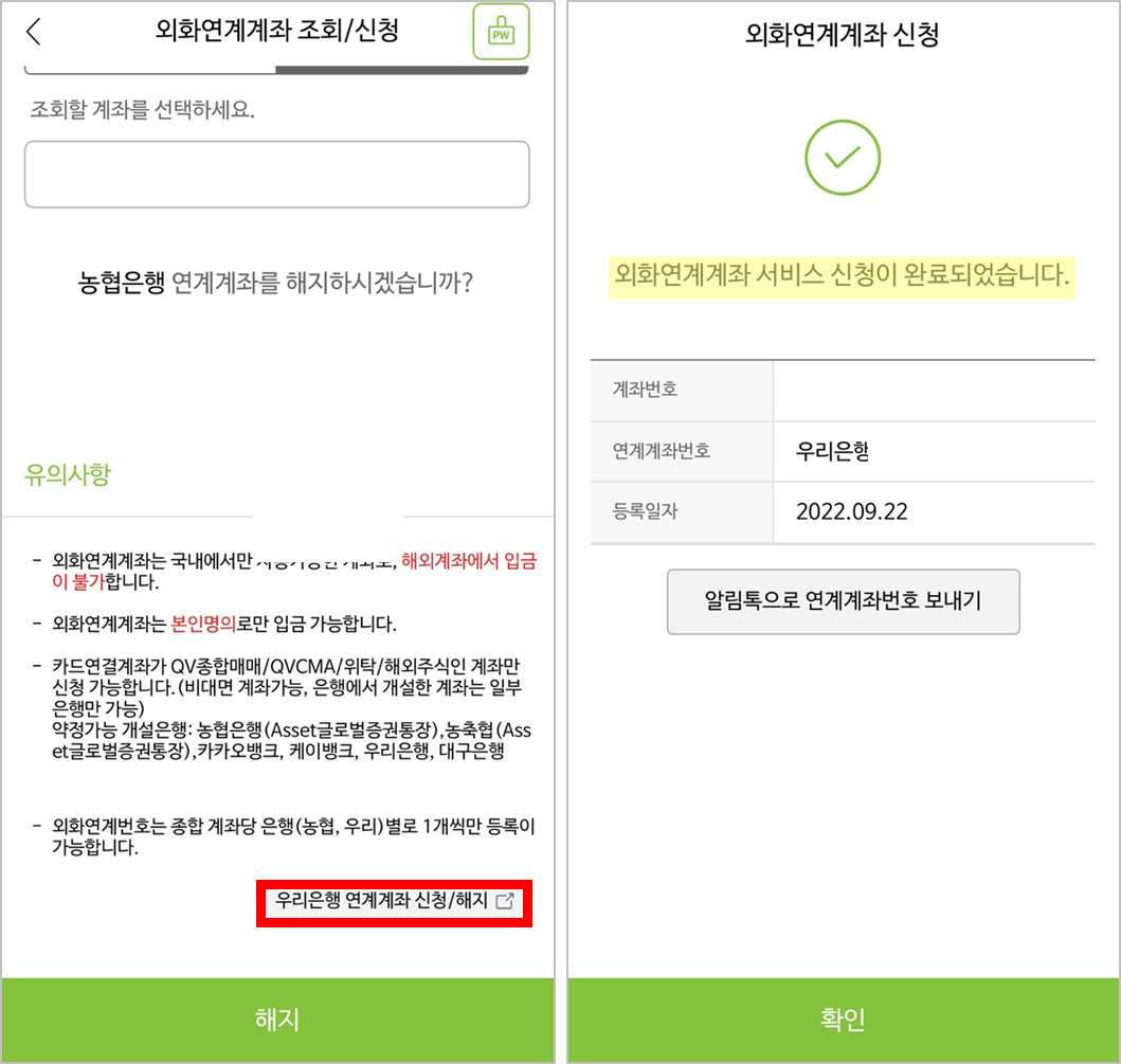 메뉴 → MY고객센터 → 개인정보/서비스 → 서비스신청/ 변경 → 외화연계계좌 서비스 신청/해지