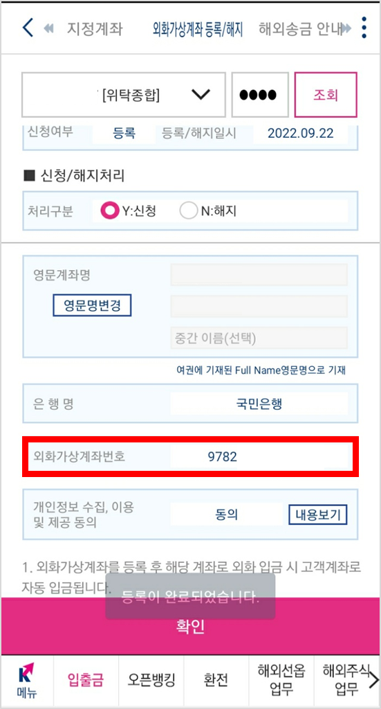 -계좌 신청 하면 아래처럼 외화가상계좌번호가 만들어진답니다.