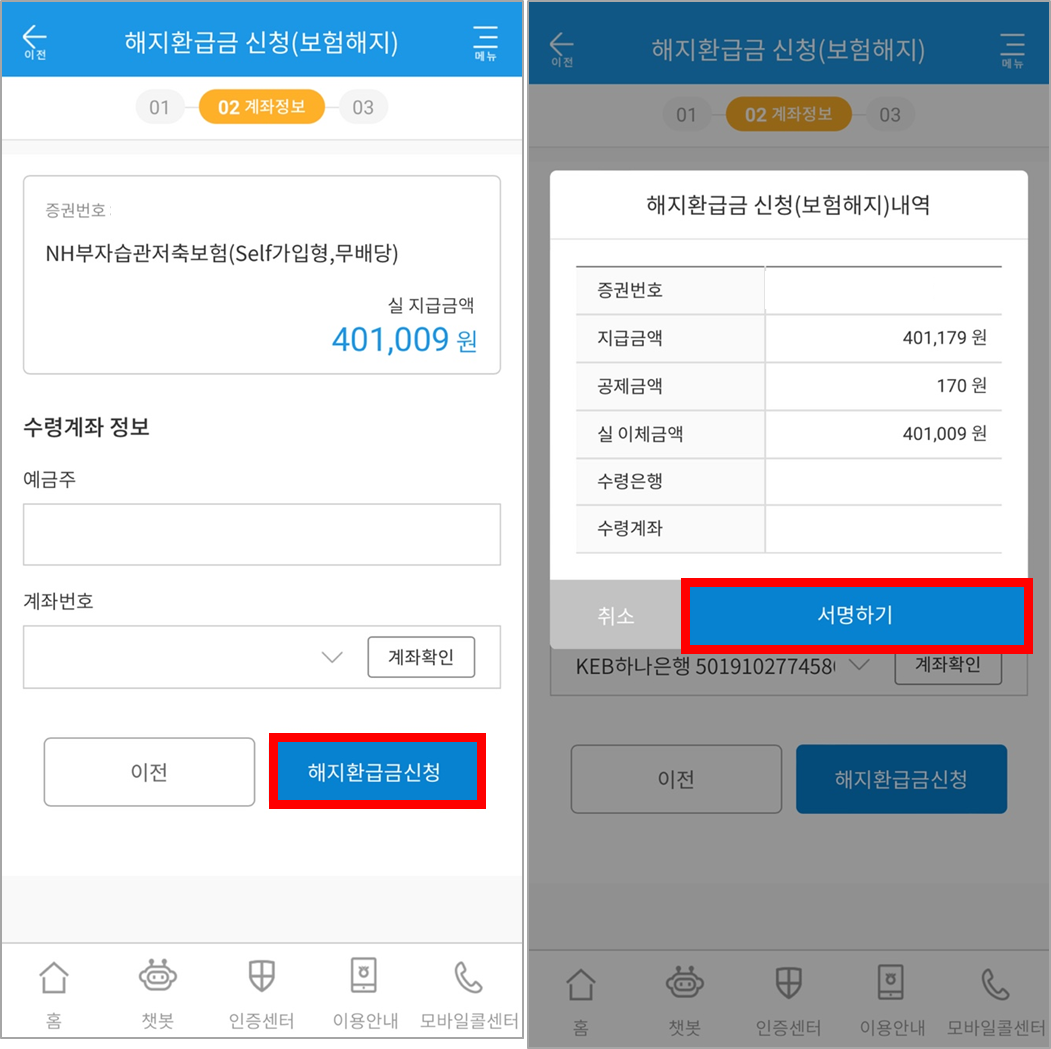 -해지환급금 받을 계좌 확인 후 서명하기 누르면 된답니다.