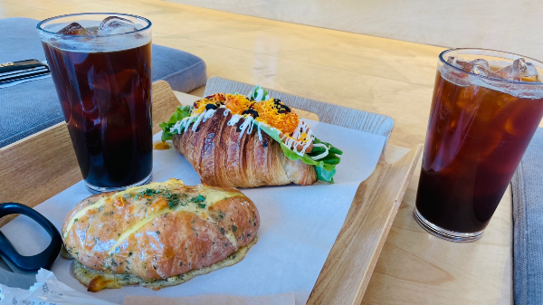 저는 요날 아이스 아메리카노, 쉬림프 토마토 샌드위치, 마늘크림치즈 소금빵 요렇게 먹었어요~