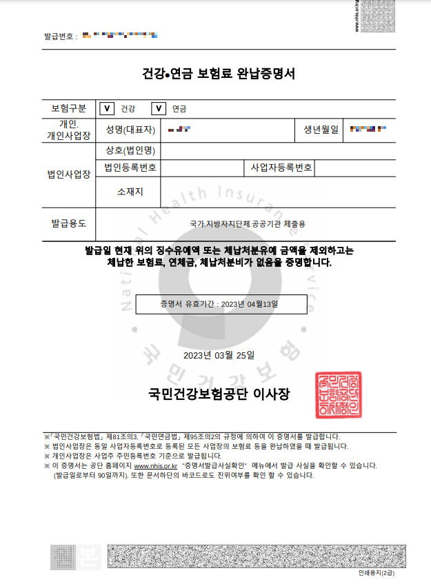 4대보험 완납증명서는 아래 국민건강보험 홈페이지에서 발급받을 수 있습니다.
