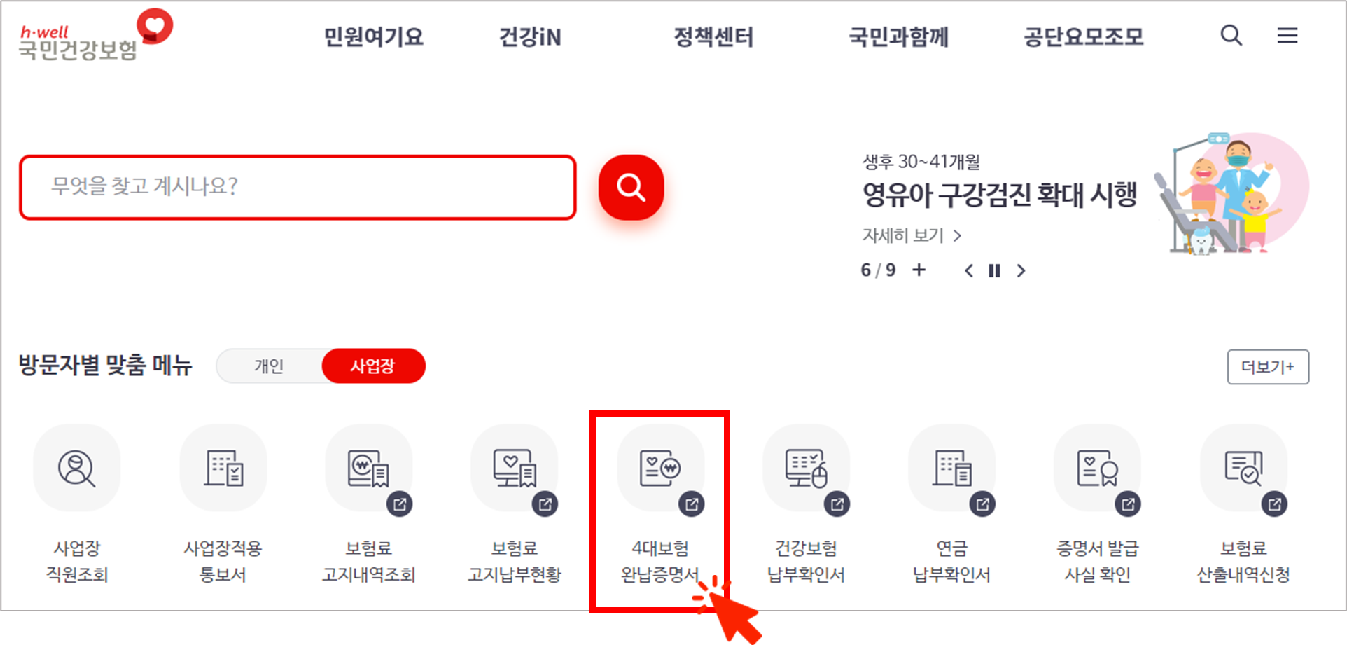 -사업자의 경우 로그인 후 메인페이지 중간의 '4대보험 완납증명서' 눌러주면 됩니다.