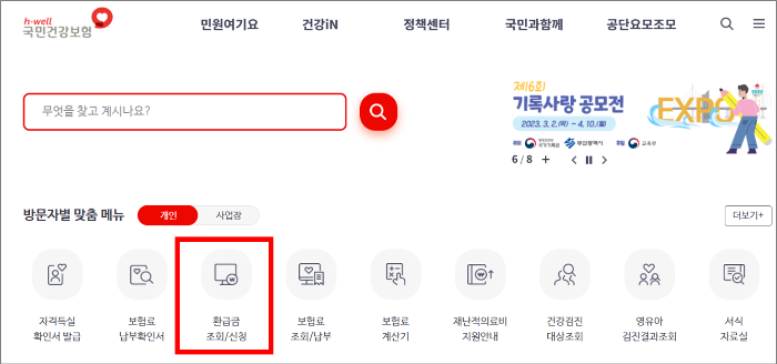 국민연금 환급금 조회하는 방법은 아래 국민건강보험 홈페이지에서 확인할 수 있습니다.