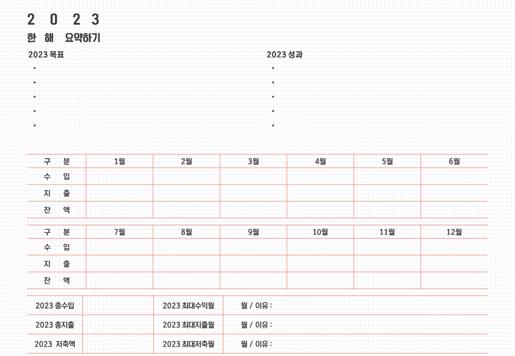 이번 페이지는 2023년 금융 목표 5개 계획하고 얼마나 달성했는지 적어볼 수 있답니다. 그리고 매달 수입과 지출, 잔액을 정리해서 얼마나 벌었고 저축했는지 알 수 있게 했습니다. 가계부를 쓰는 목적은 현재 내 수입과 지출을 파악해 다음달 수입과 지출, 저축 계획을 세우는 것이니 가장 중요한 페이지입니다.