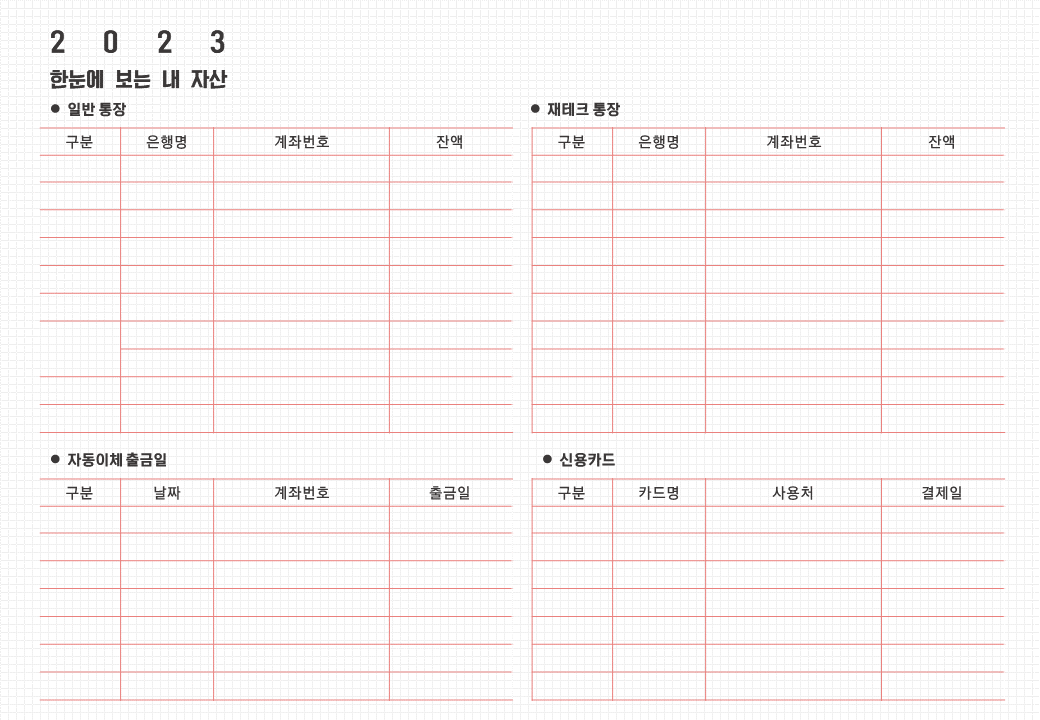 일반 통장 리스트 / 재테크 통장 / 자동이체 출금일 / 신용카드 결제일 한장에 볼 수 있도록 만들어보았습니다.