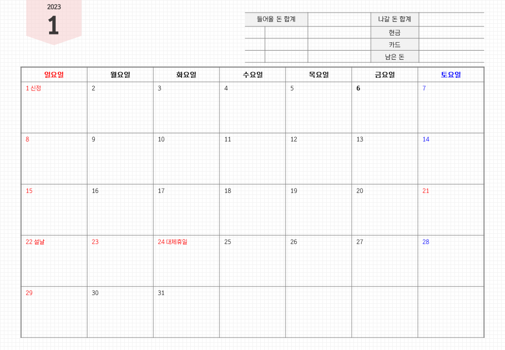 2023년 굿노트 가계부 서식의 꽃이죠. 달력 서식으로 매일 내 수입과 지출을 적을 수 있게 만들었습니다. 우측 상단에 매달 예상 수입과 지출을 적고 실제 수입과 지출을 비교해보면 좋답니다. 수입과 지출을 한장에 적기때문에 펜색으로 수입(빨강), 지출(파랑)으로 구별하면 된답니다.