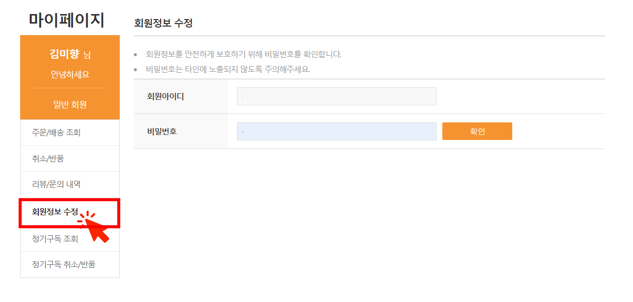 -마이페이지 접속 후 좌측 메뉴바에서 '회원정보 수정' 들어가주세요.