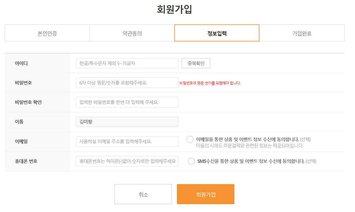 -휴대폰 or 아이핀으로 본인인증 후 약관동의 해줘요.