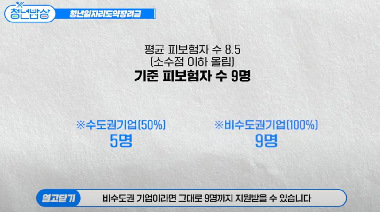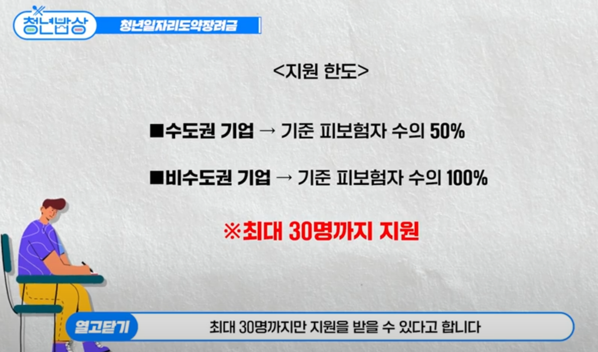 - 지원한도: 청년 일자리 도약 장려금 지원 신청 직전 월말부터 이전 1년간 평균 고용보험 피보험자 수의 50%(비수도권 지역은 100%)까지 지원 (단, 최대 30명까지 가능)