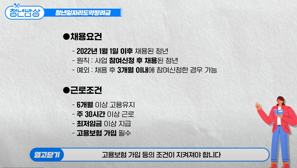 - 지원 절차: 사전 참여신청(운영기관) 후 청년 채용, 6개월 후 지원금 지급