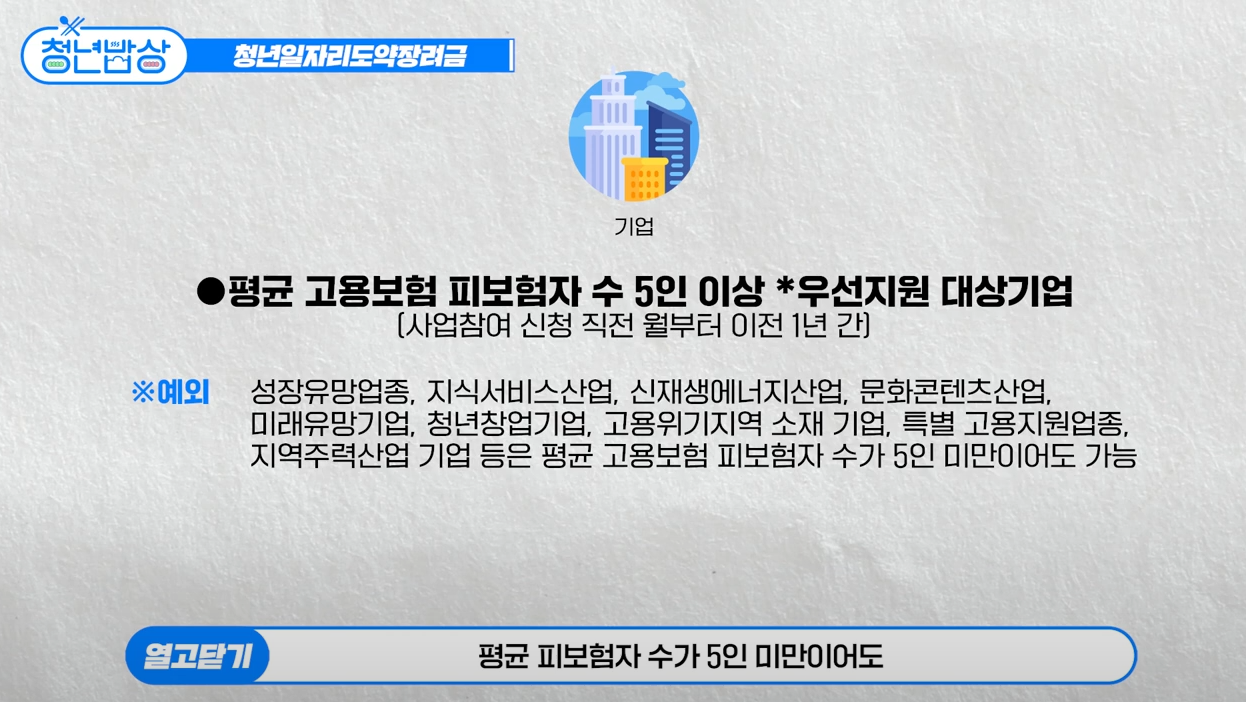 - 청년 일자리 도약 장려금 신청 직전 월 기준 이전 1년간 평균 고용보험 피보험자 수가 5인 이상인 우선지원 대상기업일 경우 지원이 가능합니다.