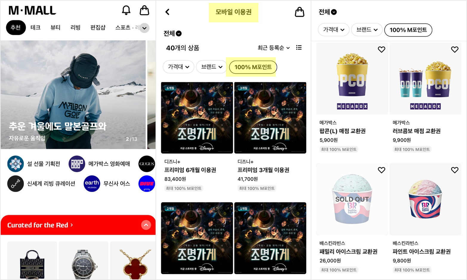 M포인트를 1:1 비율로 전환할 수 있는 방법이 M포인트몰에서 '모바일이용권' 또는 '상품'을 구매하는 것입니다. 상품은 100% 포인트 쓸 수 있는 게 적어 '모바일 이용권' 구매를 추천드립니다. 모바일이용권은 디즈니+, 메가박스, 배스킨라빈스, 파파존스, 쉐이크쉑 등 다양한 쿠폰을 M포인트로 구매할 수 있습니다.