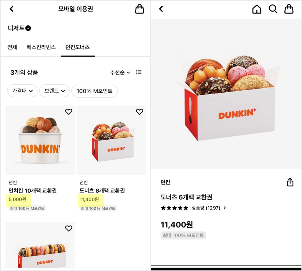 M포인트가 소액으로 5천원, 1만원대 있으면 던킨도너츠 쿠폰 구매 추천드려요. 저도 12,000포인트 있어서 던킨 6개팩 교환권 구매했답니다. 쿠폰은 구매하며 바로 문자로 발송되지 않고 쿠폰 번호 뜰 때까지 시간이 소요됩니다. 별로 알림 문자 없이 직접 M포인트몰 주문내역 들어가서 쿠폰 확인하면 된답니다.