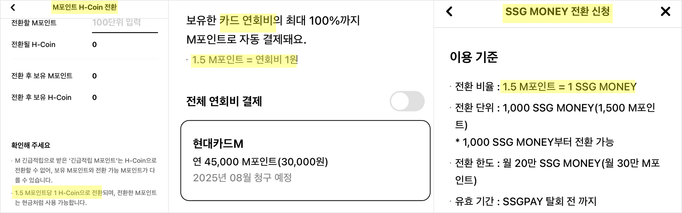 앞서 말씀드렸듯이 M포인트는 다른 카드 포인트와 달리 1:1 비율로 100% 현금화하는 것이 어렵습니다. 1:1 비율이 아닌 1:1.5 비율로 현금화가 가능하며 ①H-Coin 전환, ②제휴마일리지 전환(H.point, SSG MONEY), ③상품권 교환이 있습니다. 3가지 방법 모두 포인트 전환 비율은 동일하게 1:1.5이며 모두 현대카드 어플에서 전환 가능합니다.