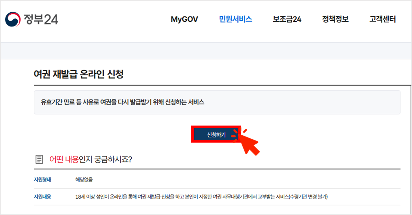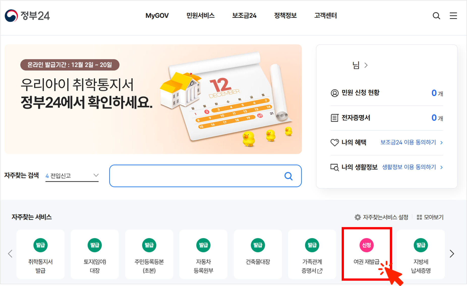 여권 재발급은 정부24 홈페이지에서 신청할 수 있습니다.