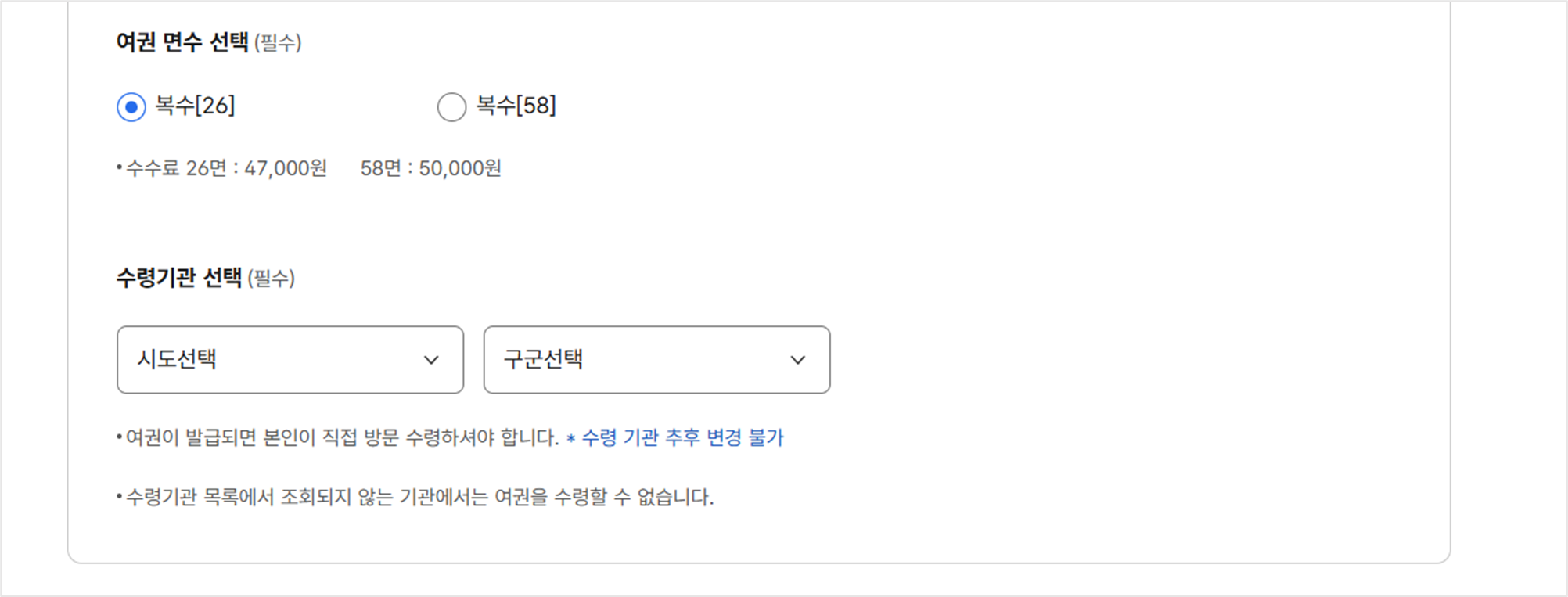 여권 면수 선택하고 수령기관 선택해 주세요.