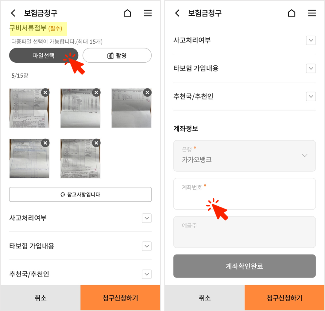 마지막으로 보험비 받을 계좌번호까지 입력하면 됩니다.