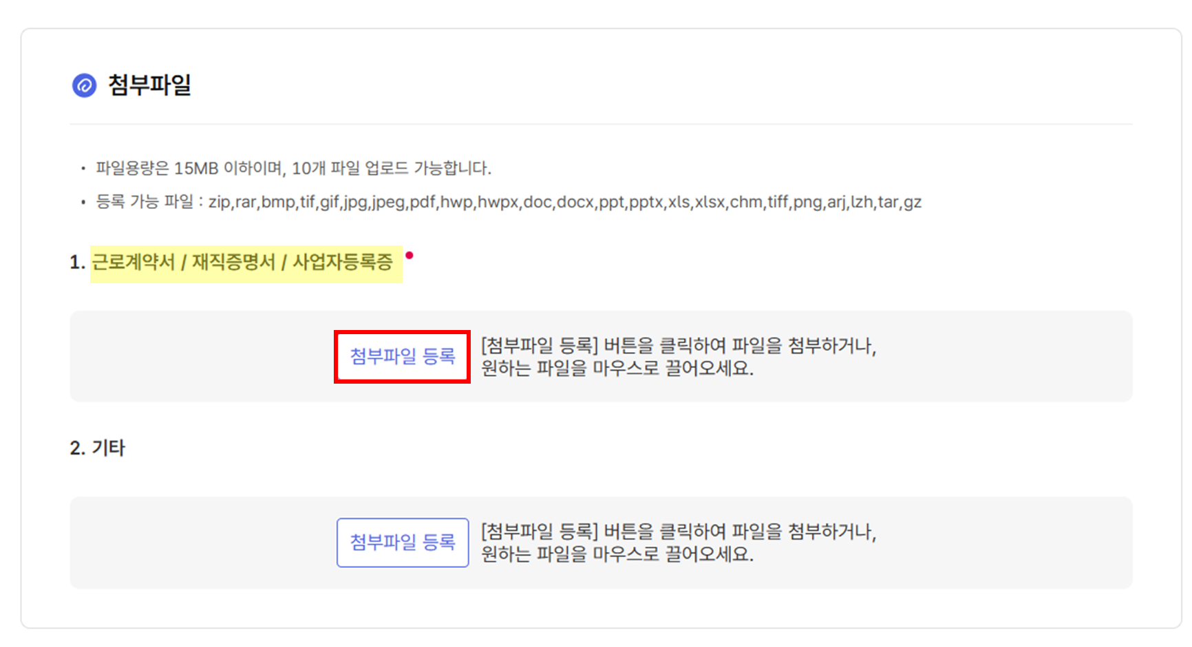 취업을 증명할 근로계약서 또는 재직증명서를 첨부파일로 등록해줍니다.