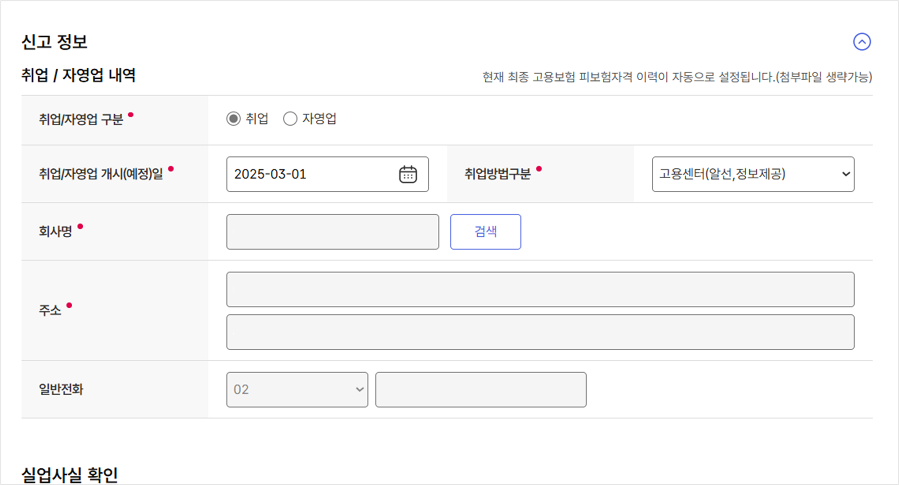 취업/자영업 구분, 취업일, 취업방법, 회사명 등을 입력해주면 됩니다.