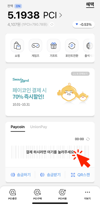 페이코인으로 결제한다고 말하고 앱 하단의 바코드로 결제하면 된답니다.