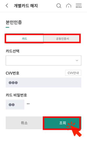 본인인증은 카드 또는 공동인증서로 가능해요.