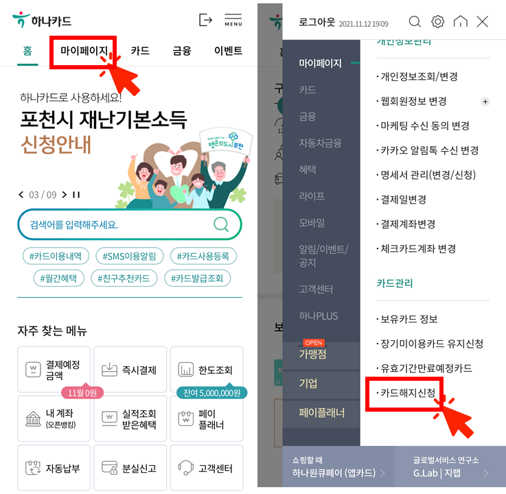그럼 오른쪽편처럼 창이 뜨고 카드관리-카드해지신청 눌러주세요.