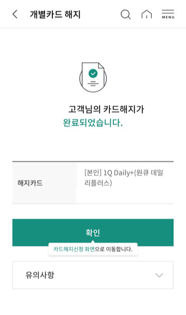 본인 인증 후 해지 카드 선택만 하면 해지가 된답니다.
