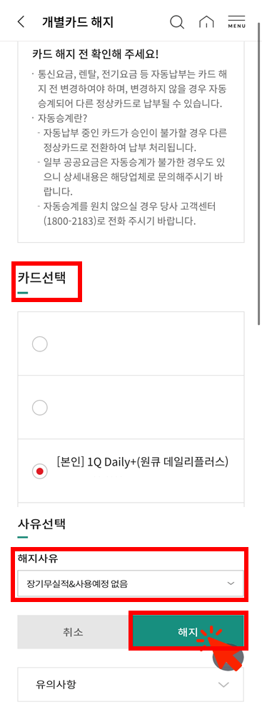 본인 인증 완료되면 해지 카드 선택하고 사유 함께 선택하면 돼요.
