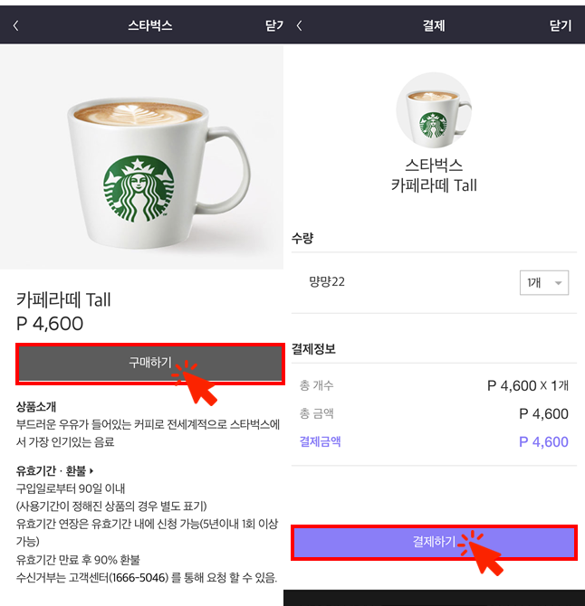 캐러멜 씨솔트+아메리카노 2잔 (13,300P), 쇼콜라 프로겐트+카페라떼 (14,200P)
