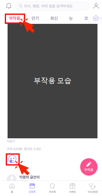 성형톡 들어와서 상단의 부작용 클릭하면 아래와 같은 화면이 뜹니다.