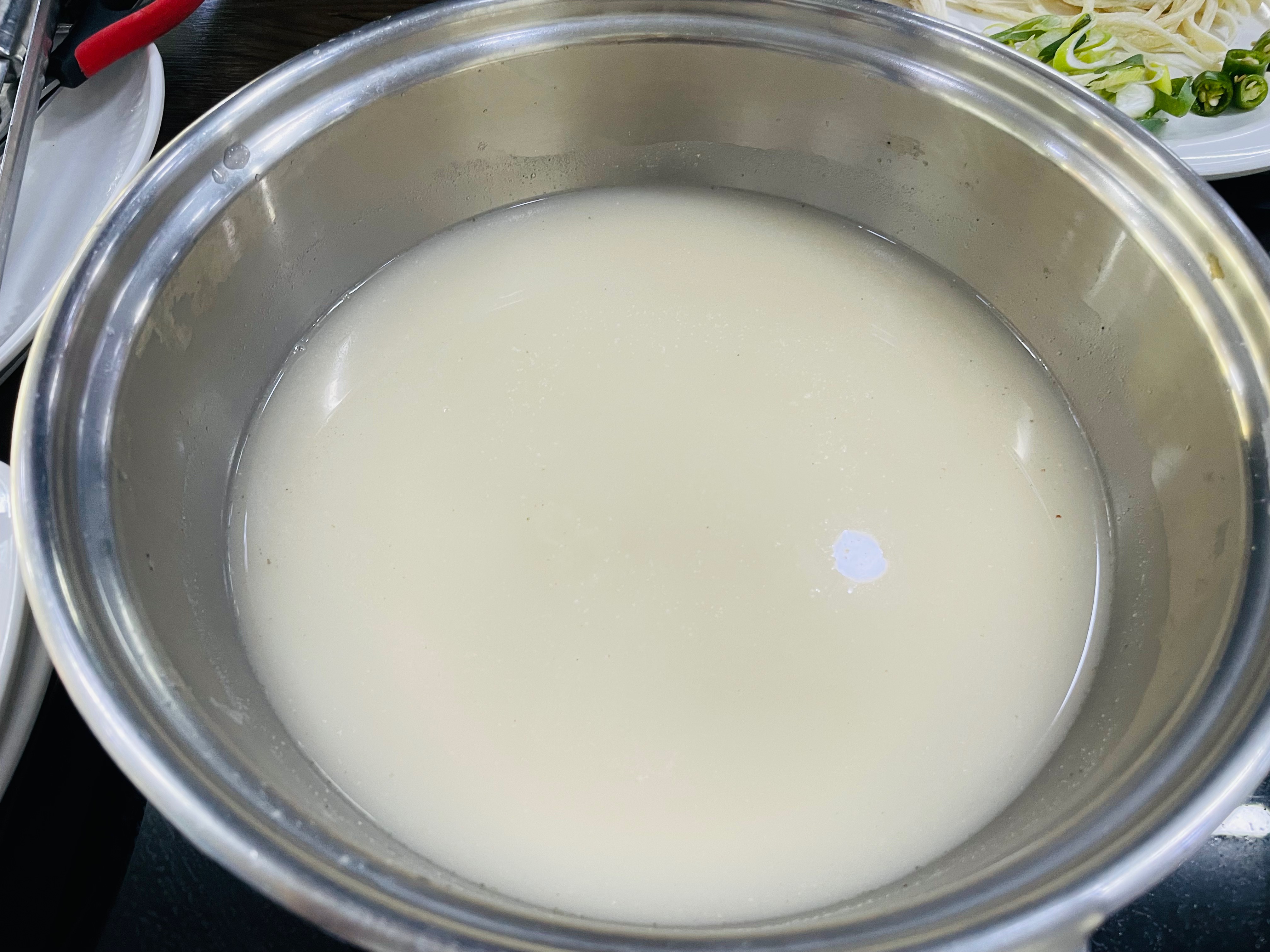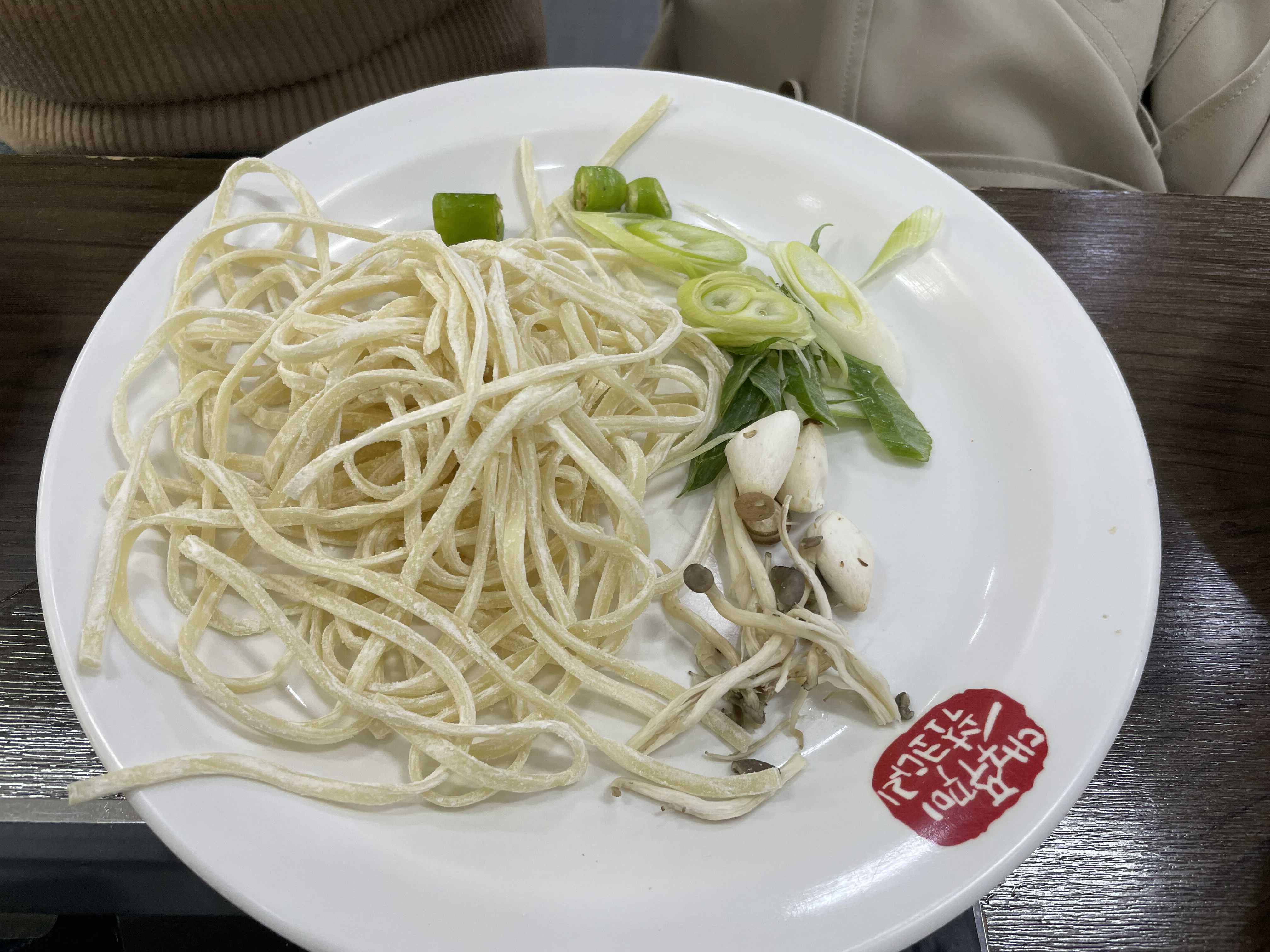 그리고 칼국수 육수랑 면, 야채가 나와요. 매콤한 쭈꾸미 볶음에 들깨칼국수 국물이 완전 환상조합이에요 ㅎㅎ