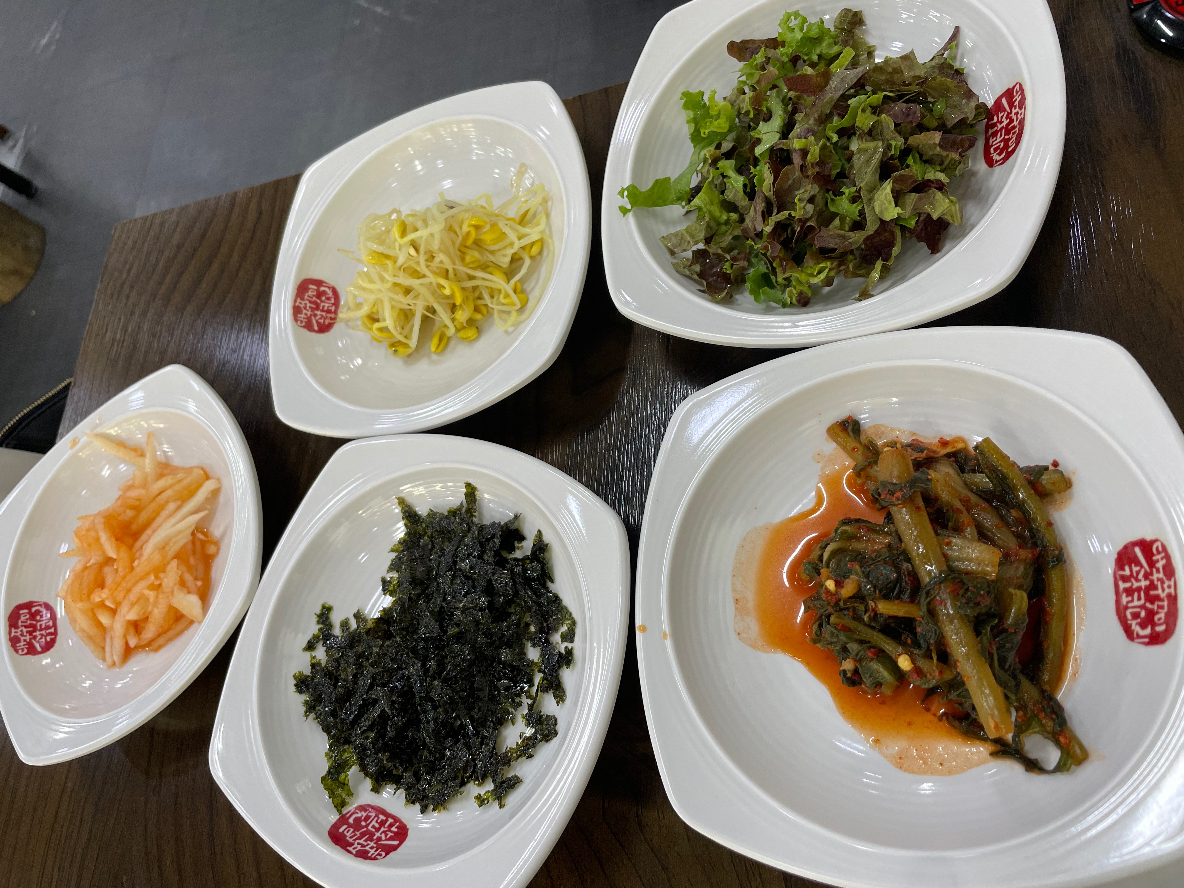 주문하자마자 기본 반찬이 세팅되요. 열무김치 빼고 나머지 반찬들은 모두 쭈꾸미랑 함께 비벼먹으면 돼요.