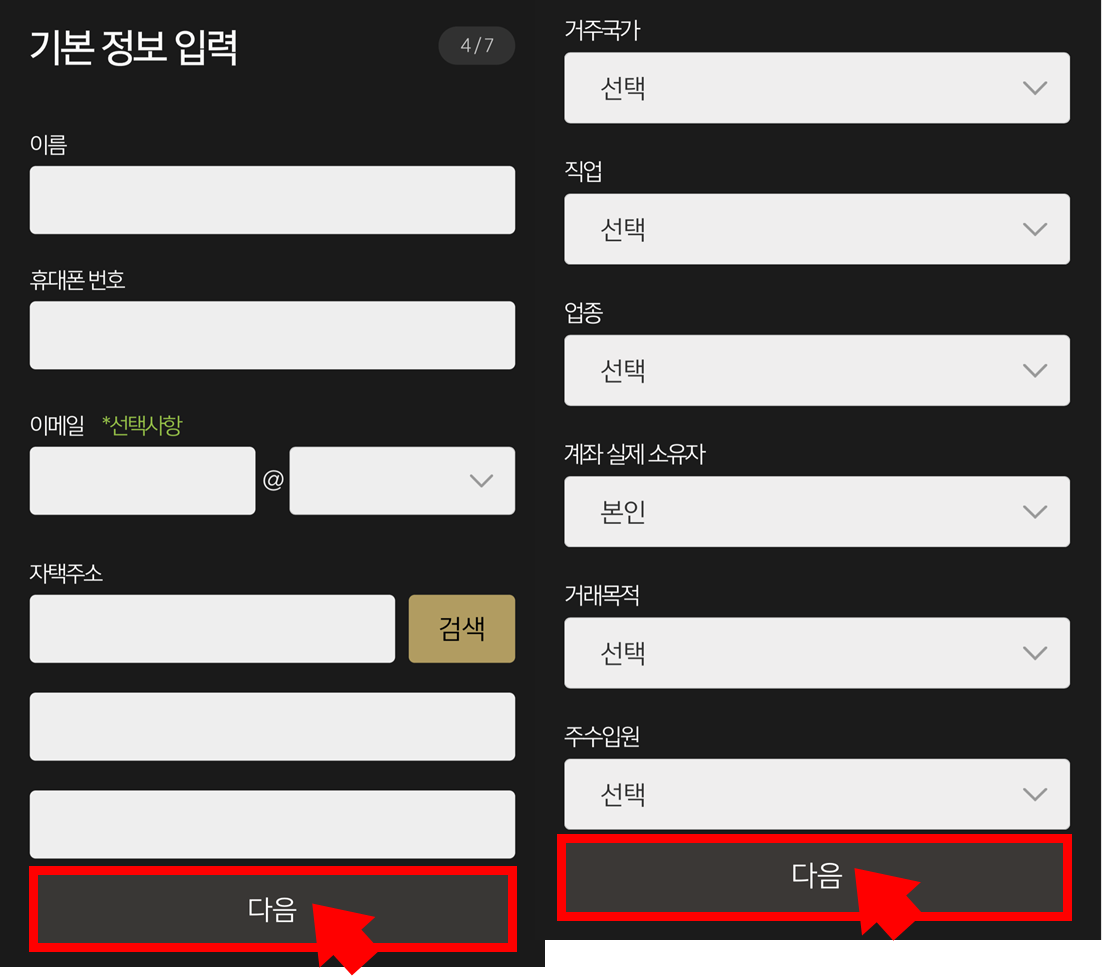 -이메일, 자택주소, 직장 주소 입력 및 거주국가, 직업 등을 선택해주세요.