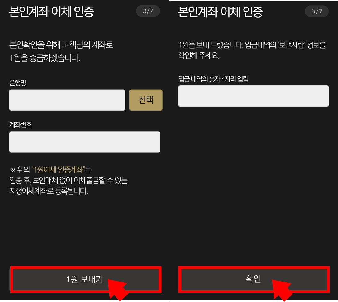 -본인 계좌 중 1원 송금받아 보낸사람 정보를 확인할 수 있는 계좌로 인증하면 됩니다.