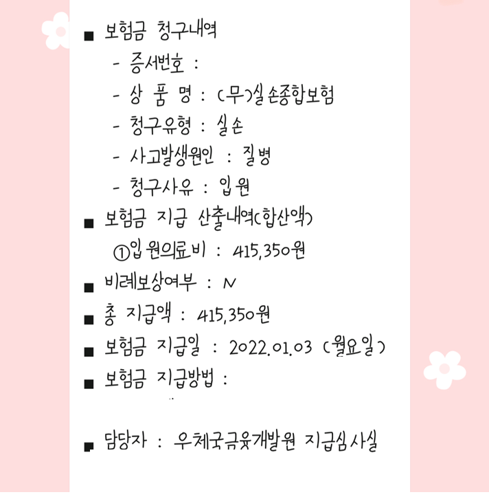 (보험금은 각 개인이 가입한 보험에따라 금액 다르니 참고만 부탁드립니다.)
