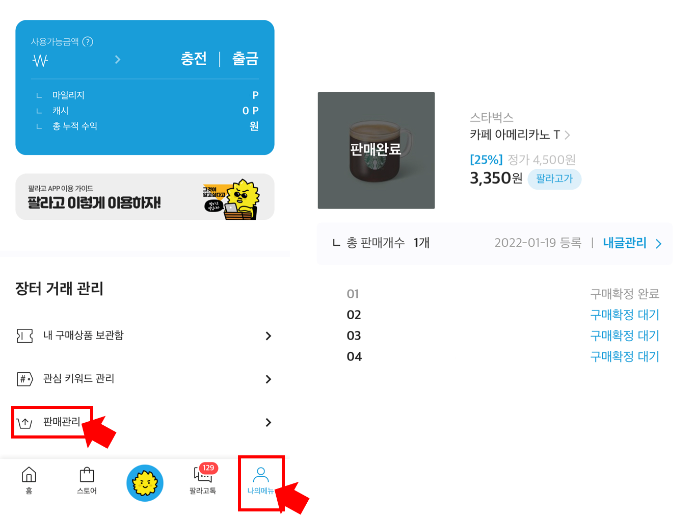 -나의메뉴 → 판매관리에서 등록한 기프티콘 확인할 수 있습니다.