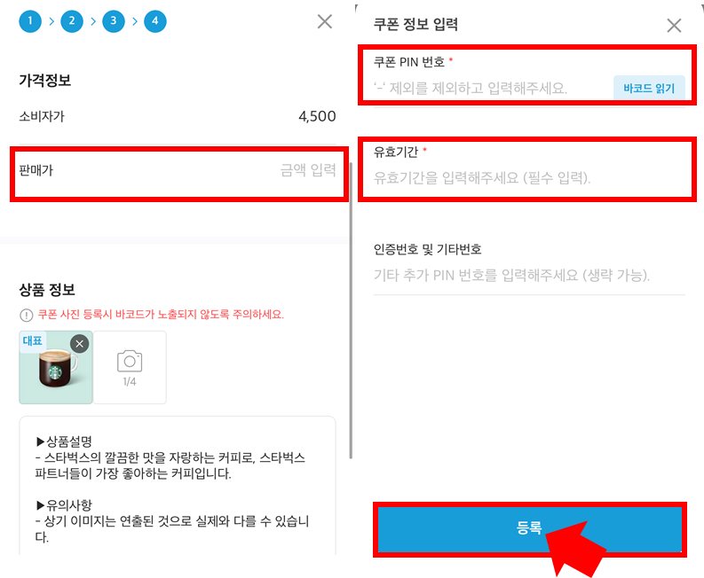 - 쿠폰 PIN 번호 : 판매할 기프티콘의 숫자 입력