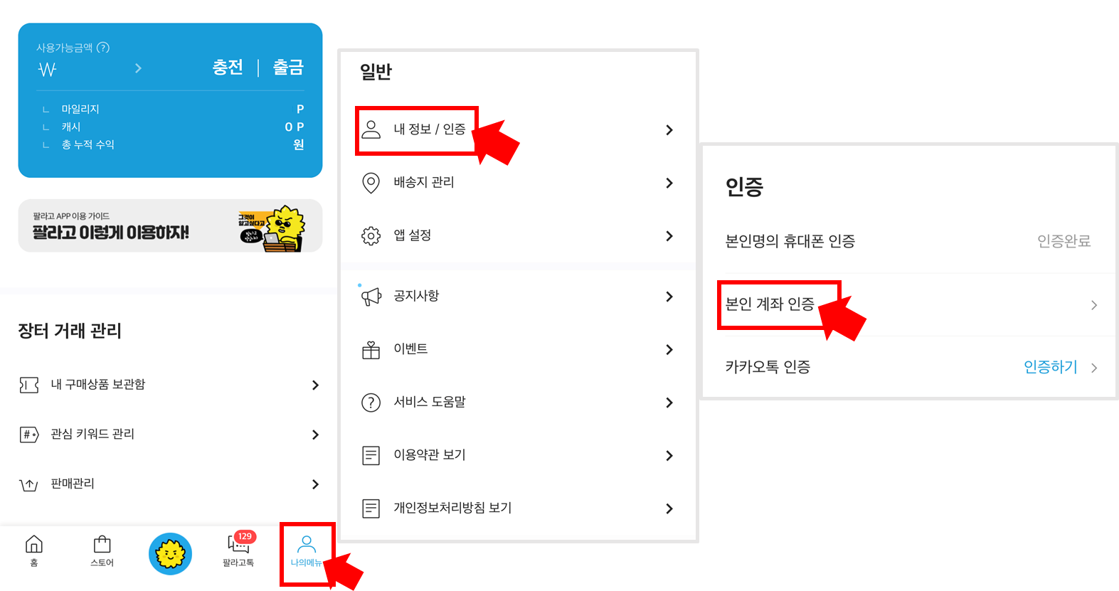 - 나의메뉴→ 내정보 → 본인 계좌 인증