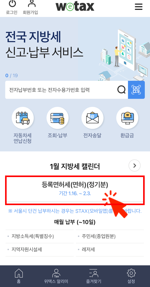 -위택스 메인페이지 가운데 등록면허세(면허)(정기분) 눌러주세요.