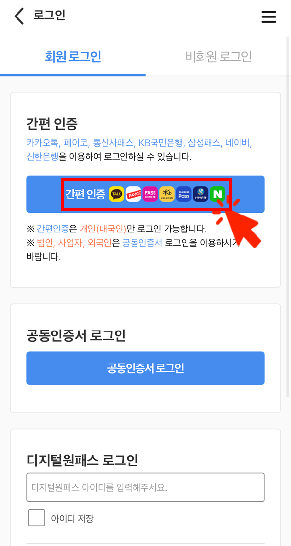 -간편인증, 공동인증서, 디지털원패스 3가지 로그인 방법 중 원하는 방법 선택해주세요.