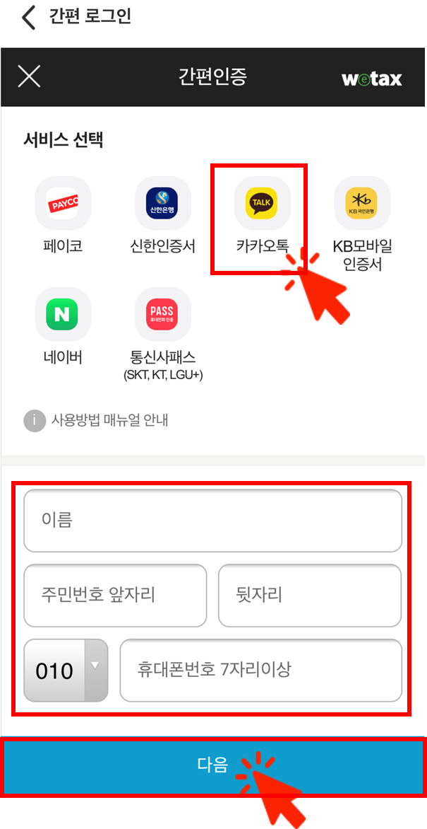 -원하는 간편인증 방법 선택 후 이름, 주민번호, 휴대폰 번호 입력해주세요.