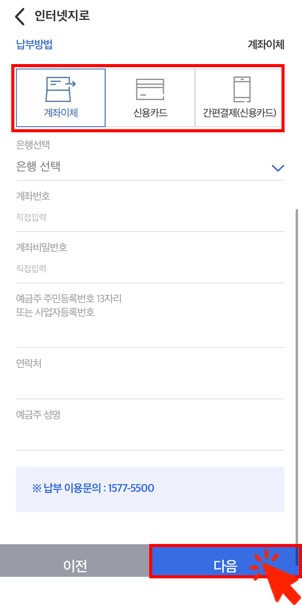 -납부 방법은 계좌이체, 신용카드, 간편결제(신용카드) 중 선택하면 됩니다.