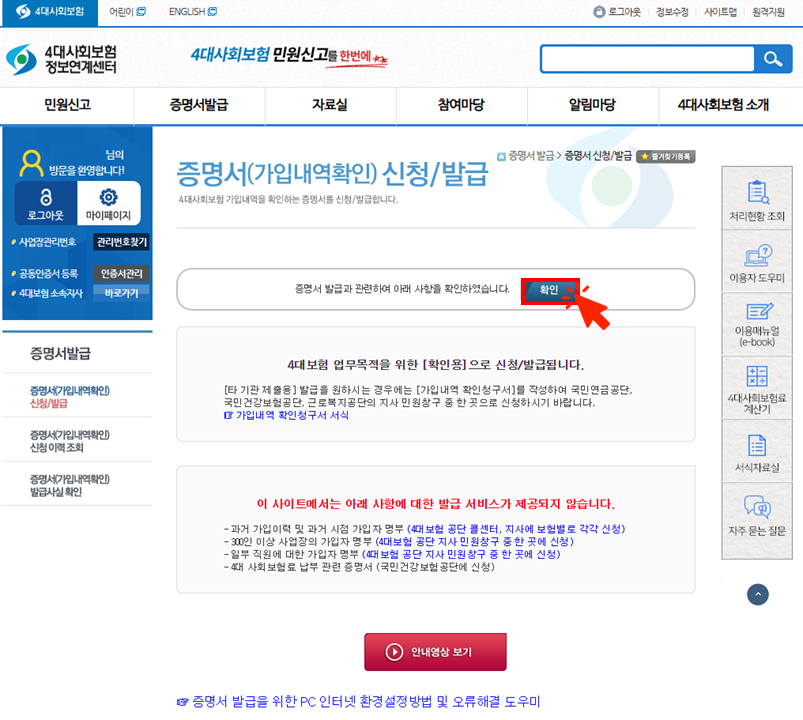 로그인 후 메인 페이지 - 증명서 발급 - 증명서(가입내역 확인) 신청/발급 순으로 들어가 주세요.