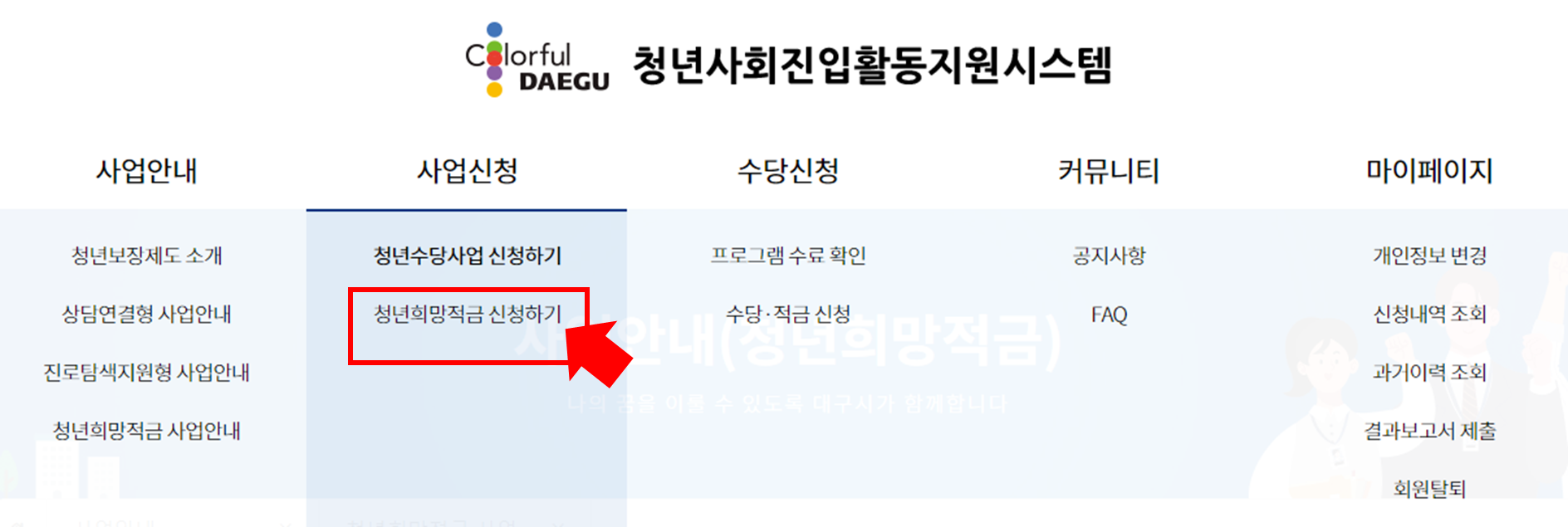 청년사회진입활동지원시스템(https://youthdream.daegu.go.kr) 신청 (PC, 모바일 모두 가능)