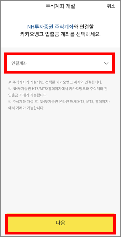 - NH투자증권 주식계좌와 연결할 카카오뱅크 계좌 선택해주세요.