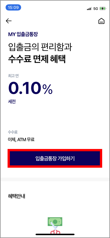 - 상단 메뉴 중 예적금 눌러준 후 MY 입출금통장 눌러주세요.