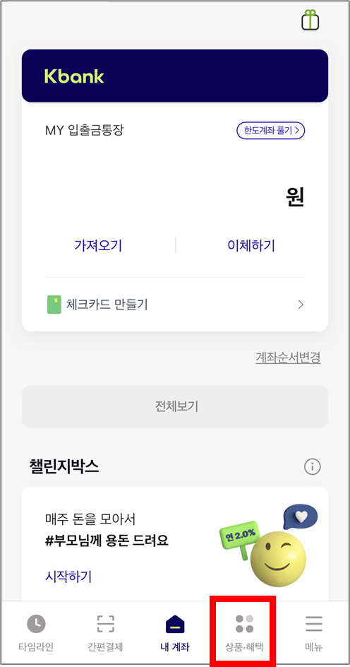 - 케이뱅크 메인페이지 하단의 상품, 혜택 접속해주세요.