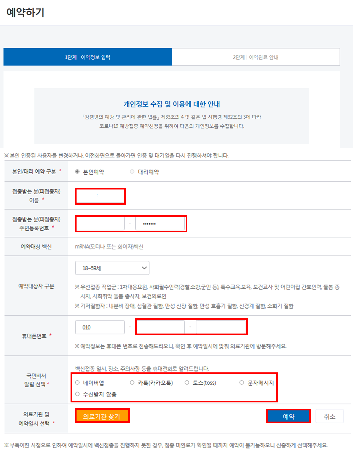 - 접종자 이름, 주민등록번호, 연락처, 국민비서 알림선택, 접종 기관 및 일시를 입력해 줍니다.