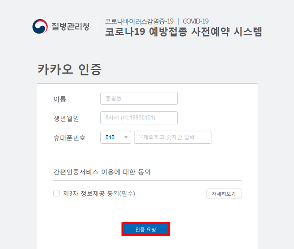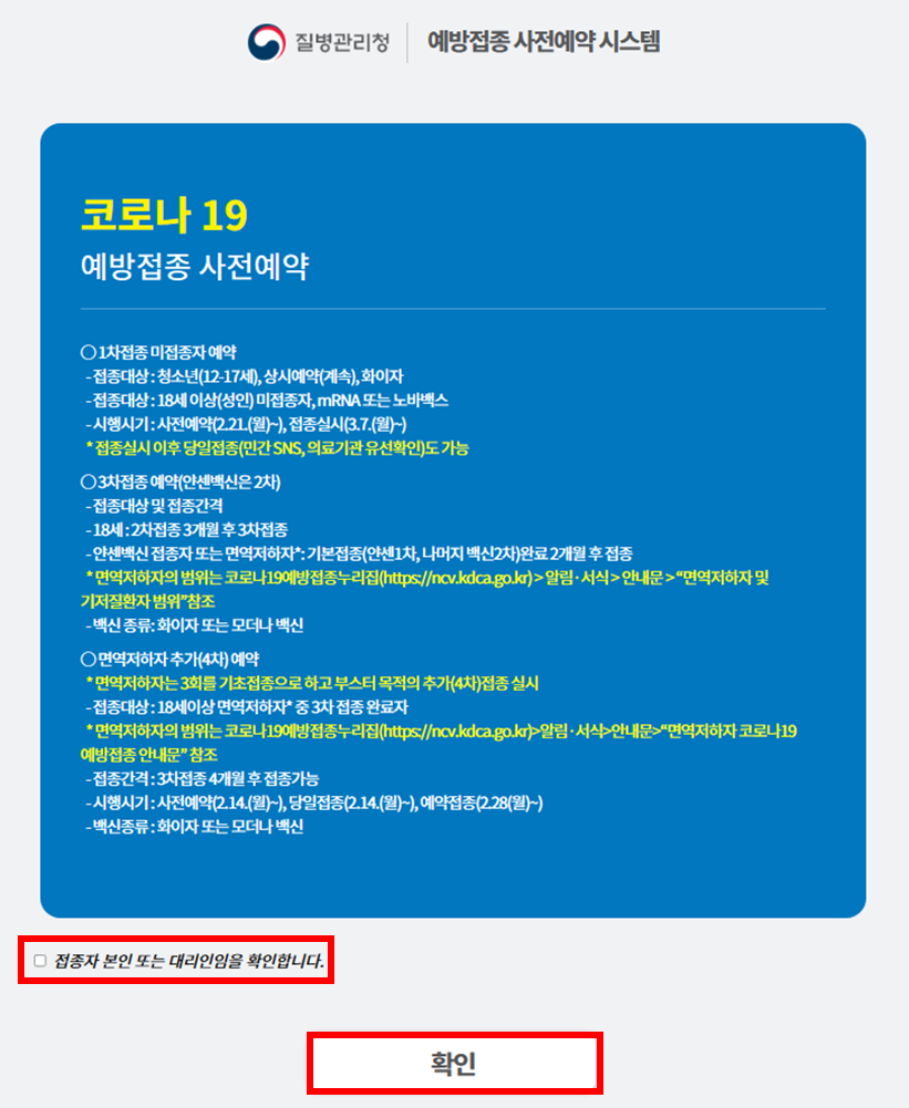 - 사전 예약을 위해 접종자 본인 또는 대리인 확인에 체크한 후 확인 버튼 눌러줍니다.