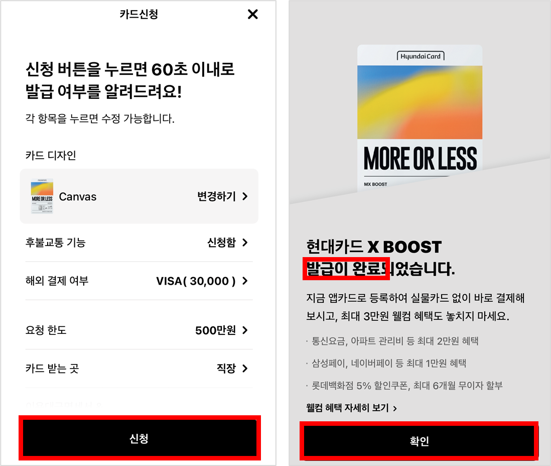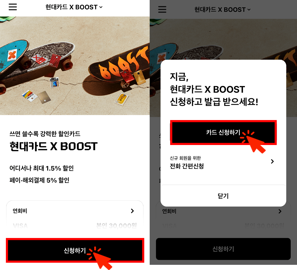 현대카드 X BOOST 발급신청하기 누른 후 카드 신청하기 눌러주세요.